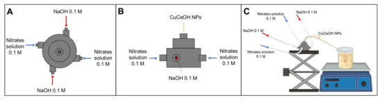 Two 60 mL syringes were filled with a 0.1 M NaOH (Merk, Steinheim, Germany). Afterwards, a metal precursor solution (0.1 M) at the desired weight ratio was prepared with Ce(NO3)3•6H2O and Cu(NO3)2•3H2O (Merck, Steinheim, Germany). The metal precursor solution was put inside other two syringes (60 mL). Then, the four syringes were connected to the MIVR inlets (Øinlet = 1 mm), as shown in Scheme 1A and 1B. The syringes are driven by a KD Scientific KDS220 infusion syringe pump (Merck, Steinheim, Germany) with the total flow rate fixed to 20 mL min−1 in order to have a turbulent flow in the MIVR reaction chamber (Øreaction chamber = 4 mm), according to previous fluid dynamic studies (Re = 8320) [52,53]. During the injection, the metal hydroxides nanoparticles (CuCeOH NPs) were formed in the reaction chamber, meanwhile the suspension was moving upward in a spiral way towards the outlet on the top of the reactor. Then, the suspension was collected into a beaker (Scheme 1C).