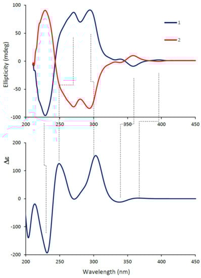 In the SM (Figure S2), a comparison with calculations at the M06 level is reported, obtaining a better match as far as wavelengths are concerned, while the shape of the spectrum was better reproduced by the theoretical spectrum presented in Figure 3 above: all features were present, even the two very weak ones observed at long wavelength. The two intense positive bands at 270 and 300 nm showed a larger separation in the calculated spectra; however, one can safely conclude that the first fraction corresponds to the P-configuration.