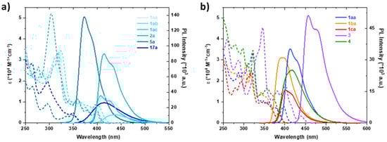 The conjugation extension from 5a to the final thiahelicenes 1aa, 1ab, 1ac, and 2a led to a significant red-shift of the optical features. Although there was no absorption for 5a over 375 nm, all of the above-mentioned thiahelicenes showed an extended absorption band up to 425 nm. The fluorescence spectra reflected the same behavior, with the 5a maximum at 372 nm red-shifted around 440 nm for the thiahelicene hybrid systems. The effect of the substituents on the helical skeleton was also investigated. Benzo fused derivative 2a showed a negligible shift when compared to 1aa, which bears two phenyl groups on the core. The replacement of one phenyl ring with an ethyl chain in the asymmetric 1ac leads to a small 5 nm blue shift of emission maximum, while the introduction of electron-rich thienyl substituents results in the red-shifted properties of 1ab, along with a decrease in the quantum yield. This overall trend was confirmed by investigating the other hybrid systems, whose UV–Vis and fluorescence spectra are reported in the Supplementary Materials (Figure S3a–d). As an example, the above-mentioned red-shifting effect caused by the introduction of two electron-rich thienyl groups could be likewise observed in the dibenzofuran and the dibenzothiophene families, where compounds 1bb and 1cb showed the most bathochromic emission within their series ( = 417 and 434 nm, respectively). Figure 5b highlights the effects of different heterocycles along the helix, when the substituents are two pending phenyl groups. Pyrene hybrid 3 was the most red-shifted and emissive system, in accordance with previous results on helicene-based analogues []. Since 1aa, 1ba, and 1ca showed an equivalent extended π-surface, their photophysical features relied on the heteroatom: emissive bathochromic shifts from X = O (1ba, = 392 nm) to X = S (1ca, = 402 nm) and, finally, to N-CH3 (1aa, = 413 nm) were observed, in agreement with the aromatic character of the heterocycles [,]. The same trend could be identified looking at the absorption spectra: while 1ba showed no absorption after 380 nm, 1ca and 1aa had an absorption shoulder at 386 nm and 397 nm, respectively. Finally, spirobifluorene-derivative 4 displayed an intermediate behavior, with the emission maximum and an absorption tail at 417 and 356 nm, respectively.