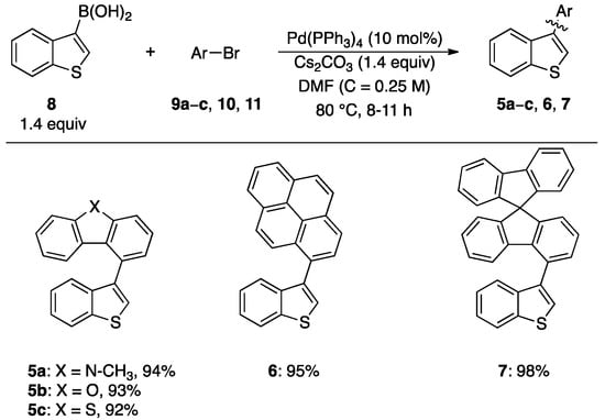 3.2. General Procedure for the Synthesis of Benzothiophene-Based Biaryls 5a–c, 6, and 7