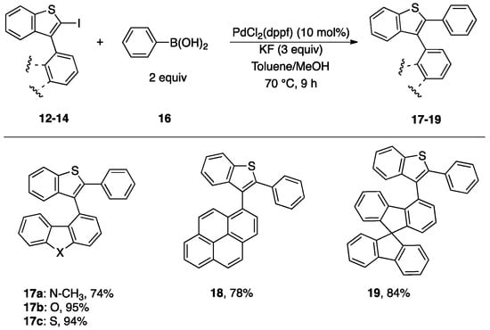 To further expand the usefulness of iodides 12–14, we also considered the possibility of synthesizing benzo fused thiahelicenes 2 through a two-step procedure involving the Pd-catalyzed Suzuki coupling between 12–14 and phenyl boronic acid (16), followed by the Mallory-type cyclization. According to this synthetic route, intermediates 17a–c, 18, and 19 were synthesized by Suzuki reactions between 12–14 and two equivalents of 16 in the presence of PdCl2(dppf) as the catalyst and KF as the base in a mixture of toluene and MeOH at 70 °C (Scheme 4).