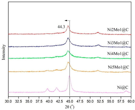The phase structure of Ni@C and NiMo@C with different Ni/Mo ratios was studied through XRD analysis, as shown in Figure 1. The XRD pattern of the Ni@C catalyst showed four diffraction peaks at 39.5°, 42.3°, 45.0°, and 59. 5°, which can be assigned to the (110), (006), (113), and (116) planes of Ni3C [1]. There existed two obvious diffraction peaks at 2θ = 44.3° and 51.7° in Ni2Mo1@C, Ni3Mo1@C, Ni4Mo1@C, and Ni5Mo1@C, which can be ascribed to the (111) and (200) planes of metal Ni. The diffraction peaks of Ni3C were undetected in Ni3Mo1@C and Ni2Mo1@C, and thus suggested that the addition of Mo could promote the formation of metal Ni and prevent the appearance of Ni3C. Above all, the results indicated that the introduction of Mo strengthened the interaction between metal Ni and Mo in NiMo@C catalysts, and the formation of NiMo alloy may be be confirmed due to the changes of the nickel’s crystal structure.
