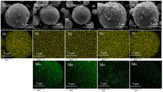 To obtain the micro-structure features of different catalysts, Ni@C and NiMo@C with different Ni/Mo ratios were investigated by SEM. As presented in Figure 2, the spherical structure was observed in Ni@C and in the different ratios of NiMo@C catalysts. With the increasing amount addition of Mo in NiMo@C, the particle size of the spherical structure increased gradually, which was in alignment with the TEM results. In addition, metal Ni and Mo were still evenly distributed, which was observed by element mappings. The element mappings also clearly exhibited that the content of Ni increased and the content of Mo decreased in catalysts with Ni/Mo ratios from 2:1 to 5:1.