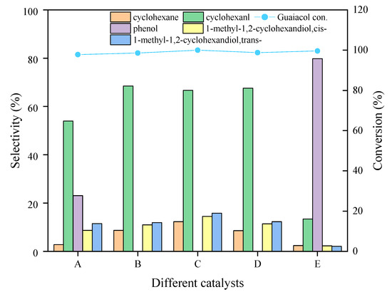 Figure 4. Guaiacol conversion and product distribution over different catalysts. Reaction conditions: T = 240 °C, p = 2 MPa, and t = 4 h; catalysts: (A) Ni@C, (B) Ni5Mo1@C, (C) Ni4Mo1@C, (D) Ni3Mo1@C, and (E) Ni2Mo1@C.