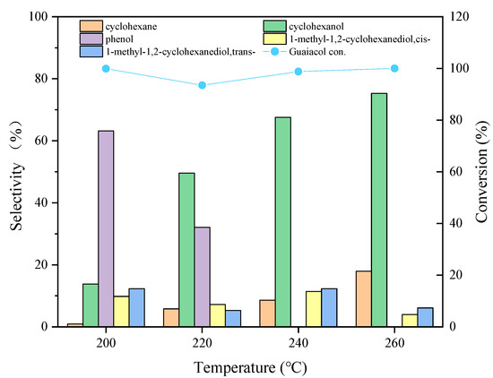 Reaction temperature has a great effect on the hydrodeoxygenation reaction and product distribution. The guaiacol conversion and product distribution over Ni3Mo1@C with an initial hydrogen pressure of 2 MPa is shown in Figure 5. It can be observed that the guaiacol conversion maintained a high proportion (around 100%) when the reaction temperature increased from 200 °C to 260 °C with a reaction time of 4 h, while the selectivity of cyclohexanol rapidly improved from 13.8 to 75.3% and the selectivity of cyclohexane exhibited a similar tendency, increasing from 0.9% to 17.6%. Interestingly, when the reaction temperatures were 200 °C and 220 °C, phenol was a main product, with relatively high selectivity levels of 63.2% and 32.1%. However, the selectivity dramatically decreased from 63.2% to 0 when the reaction temperature was enhanced to 240 °C. These results indicated that the conversion of guaiacol to cyclohexanol may be conducted at relatively high temperatures, and higher temperatures helped to facilitate the hydrotreatment of guaiacol, which was also reported in the previous studies. It was very common for high temperatures to easily contribute to the dearomatization of the benzene ring [2]. Sels et al. reported that higher reaction temperatures (e.g., 250 °C or 300 °C) favored the conversion of guaiacol to cyclohexanol [46]. Tomishige et al. also confirmed that a high selectivity of cyclohexanol could be obtained at a high reaction temperature during the HDO of guaiacol [47]. Taken together, in this work, the selectivity of cyclohexanol at 260 °C was slightly higher compared with 240 °C; however, the difference is little. Considering the energy consumption, we finally chose the 240 °C as the optimum reaction temperature over the Ni3Mo1@C catalyst.