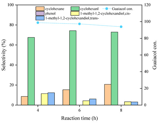In addition to reaction temperature and hydrogen pressure, the catalytic activity was also greatly influenced by reaction time. It was reported by Sels et al. that hydrodeoxygenation and repolymerization would occur simultaneously when the reaction time is less than 3 h and reaction temperature is less than 200 °C. Herein, a longer reaction time (e.g., 4 h, 6 h, and 8 h) was investigated over Ni3Mo1@C at 240 °C to study the change of product distribution. As can be seen in Figure 7, the conversion of guaiacol was maintained at almost 100%, which did not change a lot. However, there was an improvement of cyclohexane selectivity with the increase in reaction time, while the selectivity of cyclohexanol and total 1-methyl-1,2-cyclohexanediol (cis- and trans-) decreased. As was reported by Tomishige and Sels, the HDO of guaiacol to cyclohexanol is a complex process, including direct hydrogenation, hydrodeoxygenation, demethoxylation, and so on. Therefore, a proper reaction time is crucial to the HDO of guaiacol. Taking the selectivity of cyclohexanol and cyclohexane into consideration, 4 h was finally chosen as the optimum reaction time for the hydrodeoxygenation process.