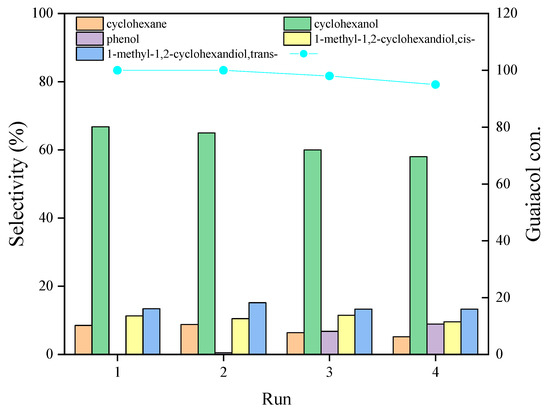 The reusability of the Ni3Mo1@C catalyst was also investigated. Herein, a batch of Ni3Mo1@C catalysts was used repeatedly for the HDO of guaiacol at 240 °C for 2 h with an initial H2 pressure of 2 MPa. The results, seen in Figure 8, indicated that the catalyst still showed good catalytic activity after four uses, with a subtle decrease of cyclohexanol selectivity.