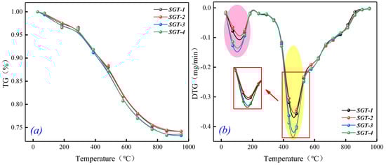 It can be seen from Figure 1 that the slopes of the four samples are roughly the same, which means that the decomposition rates of the four samples are the same under the same conditions. The DTG curves display that the samples experienced two weight losses during pyrolysis. The first weight loss was due to the evaporation of water in the sample []. The second weight loss was caused by the thermal decomposition of coal samples. The DTG curve fluctuated around 700 °C, mainly due to the decomposition of minerals in coal []. DTG curves of SGT-3 and SGT-4 were significantly different from other samples. The main reason was that the yield of volatile matter in SGT-3 and SGT-4 coal samples was higher than that of other coal samples. During this period, the devolatilization reaction mainly occurred in coal samples, including the depolymerization of macromolecules, through weak bridge bond and the removal of fatty side chain-cracking reactions in macromolecular structure, which led to the weight loss rate of coal samples higher than other coal samples [].