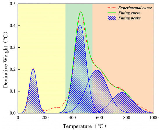 The TG and DTG curves of the coal samples at 10 °C/min are shown in Figure 1. Evidently, the pyrolysis behavior of the sample occurred at temperatures higher than 400 °C, and the decomposition reaction continued as the temperature was increased. As shown in Figure 1, the DTG curve was asymmetric and could obviously be divided into multiple steps []. Therefore, PeakFit software was used to separate the overlapping peaks by adopting the Gaussian multipeak fitting method.