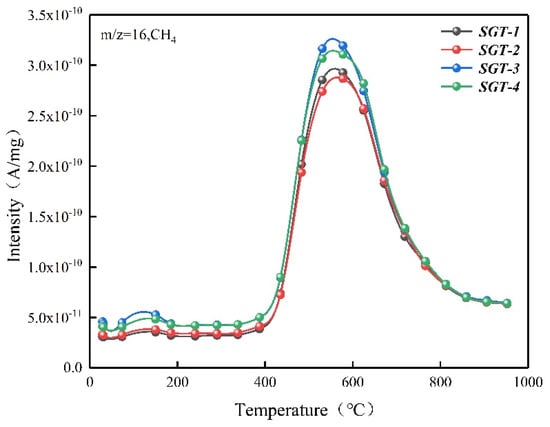 The generation curves of CH4 are shown in Figure 3. CH4 is the main gaseous hydrocarbon product in the pyrolysis process []. From Figure 3, it can be seen that the main temperature range of methane generated was 400~900 °C. With the increase in temperature, the release rate of CH4 increased first and was then reduced, reaching a peak at near 550 °C. In the low-temperature stage, CH4 mainly came from the breaking of the C–C bond in aliphatic chains, whereas the formation of CH4 at higher temperatures was due to the cleavage of stronger bonds [].
