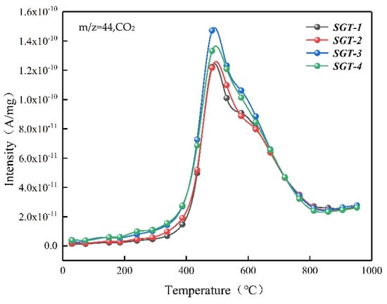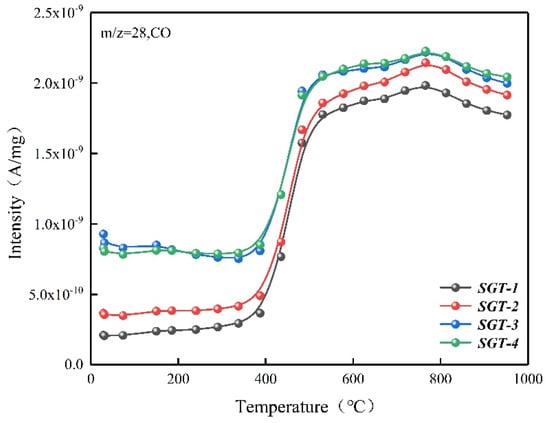 CO2 appeared at nearly 100 °C and reached its peak at about 500 °C (See Figure 4). Then, with the increase in temperature, the release rate of CO2 began to come down. According to previous articles [,,], the sources of CO2 included carbon dioxide adsorbed in coal, decomposition of carbonate, and fracture of oxygen-containing functional groups. The formation of CO2 in the early stage was related to the decomposition of the carboxyl group, while the latter was mainly the decomposition of ether structures and oxygen-bearing heterocycles.