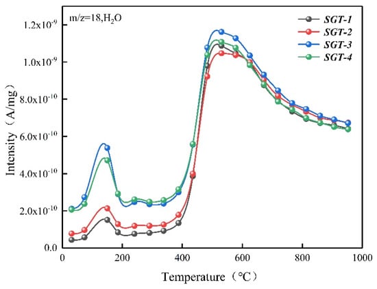From Figure 5, it can be seen that there are two main peaks in the evolution curves of H2O. H2O appeared at about 50 °C. With the temperature increased, the yield of H2O went up and reached the first peak at nearly 150 °C and another one at about 540 °C. The temperature range of the first peak was from 70 °C to 200 °C. At this stage, the H2O mainly came from the sample []. The other peak temperature range was about 400~800 °C. The release of water in the high-temperature section was mainly due to the decomposition of oxygen-containing functional groups [].