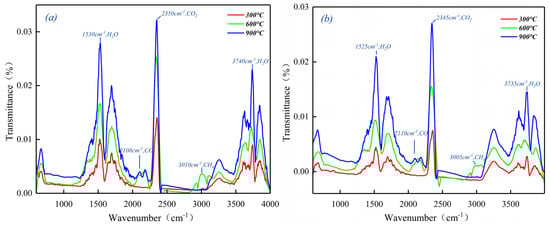FTIR technology can be used to capture the volatile products of coal pyrolysis on line. The change of absorption peak of the infrared spectrum can indirectly reflect the generation law of gas species and relative yield [,]. The reaction and volatile species in the pyrolysis process mainly depend on the amount of oxygen-containing functional groups, aromatic rings, and aliphatic branched chains [,].