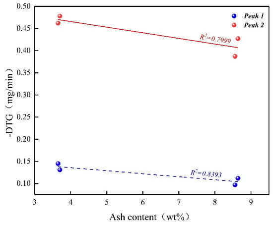 Figure 10 shows the relationship between ash content and maximum weight loss rate, which is negatively correlated. The decrease in ash content deepens the degree of pyrolysis products, which leads to gas products increasing in varying degrees. Ash content has an obvious impact on the generation of CH4 and CO and a weak impact on the generation of H2O and H2, which is consistent with previous research results []. The influence of ash on coal pyrolysis mainly comes from the minerals in coal. Minerals can catalyze or inhibit coal pyrolysis.