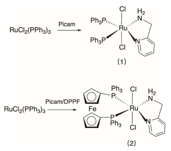 The reaction of trans-RuCl2(PPh3)3 with a 1:1 molar ratio of 2-picolylamine (Picam) in methylene chloride complexes 1 yielded RuCl2(PPh3)2(Picam) (see Figure 1). From complex 1 via consecutive substitution reactions by addition of one equiv. of 1,1′-bis(diphenylphosphino)ferrocene (DPPF) to a solution of (RuCl2(PPh3)3+2-picolylamine) under aerobic conditions resulted in a rapid color change from blackish-purple to red, and straightforward work-up of the solutions gave high yields of high-purity yellow products of complex 2. In addition, trans-RuCl2(PPh3)2(Picam) complex 1 was crystallized from the solution.