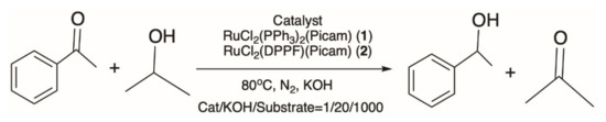 Hydrogen-transfer experiments were carried out in standard Schlenk glassware [25,26]. All reactions were set up in a dry glove-box under N2 using 10−5 M catalyst in 2-propanol (10 mL), the test calculated amount of acetophenone (PhCOCH3) was loaded in a final molar ratio of catalyst/KOH/substrate was in 1:20:1000. The temperature was set to 80 °C under refluxed and quickly magnetic stirring. The yields were calculated after the products were isolated and measured using gas chromatography (GC) by comparison with data of known compounds.