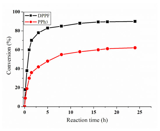 Herein, the activity of homogeneous catalytic transfer hydrogenation of ketones (C=O bond) for the synthesized pre-catalysts of Ru(II) complexes 1 and 2 was tested in basic isopropanol at 80 °C under an inert nitrogen atmosphere (Figure 3) [25,26]. All of the tested complexes performed the homogeneous catalytic hydrogen transfer reactivity effectively under the given conditions (Table 1). Under identical conditions, activities of transfer hydrogenation of acetophenone in a basic 2-propanol for complexes 1 and 2 are very different (Table 1). The time dependence of the conversion rate versus the reaction time is shown in Figure 4 for complexes 1 and 2 under the experimental conditions (see Table 1). The conversion data indicate that complex 2 is a more efficient hydrogen-transfer catalyst than complex 1 under these conditions. The only structural difference between these two complexes is the monodentate phosphine ligand in 1 and bidentate phosphine ligand in 2.
