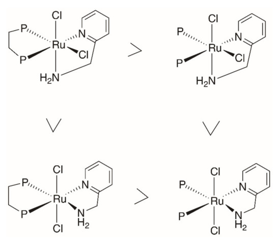 In addition, coordinated chlorides were considered being replaced by hydrides in the hydrogen transfer reactivities. In all Ru(II) complex pre-catalysts, the chlorides in trans-configuration showed lower catalytic activities than that for the cis-chlorides configuration. It has been reported in the literature that monodentate phosphine (P) is almost twice as catalytic in cis-chlorides than in trans-chlorides. Meanwhile, bidentate phosphine (P–P) is almost 10 times as reactive in cis-chlorides than in trans-chlorides [27]. The cis-hydrides are much more efficient in transferring hydrides from the Ru metal center to the ketone substrates. In summary of our tested results and literature data, the relative activities of Ru(II) complexes in different structures and configurations as hydrogen transfer catalysts are shown in Figure 5. The reactivities are closely controlled by the coordination type of ligands and by the chloride configuration.