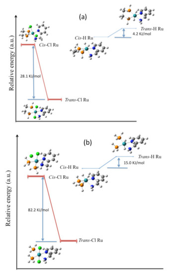 DFT calculation results show that for both monodentate and bidentate phosphine ligands, the cis-chloro to cis-hydride transformation is more energy favorable. This explains why the cis-chloro configuration shows highly catalytic reactivity. Comparing the monodentate with the bidentate, the latter ligand requires less energy than the monodentate ligand (Figure 6). This suggests that the monodentate phosphine ruthenium complex consumes more energy to form a hydride Ru-complex, which is the activated catalyst species. This is also consistent with the experimental test results for this system from the data presented here and in the literature [14,22].