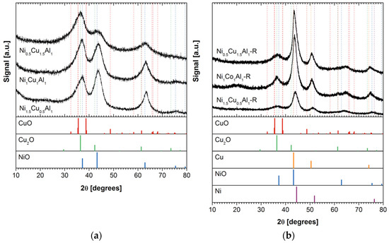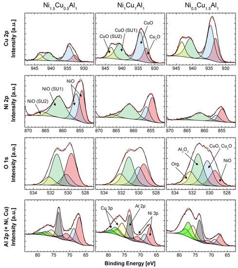 | Calcined Material | Ni 2p (NiO) | Ni 2p SU1 (NiO) | Ni 2p SU2 (NiO) | Cu 2p (Cu2O) | Cu 2p (CuO) | Cu 2p SU1 (CuO) | Cu 2p SU2 (CuO) | Al 2p (Al2O3) |