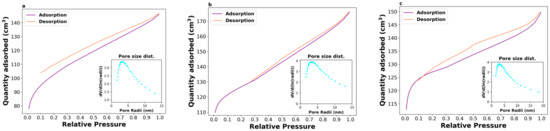 N2 adsorption–desorption isotherms at 77 K and pore size distribution on: (a) CAG, (b) Fe/CAG, and (c) Fe/CAG-ps.