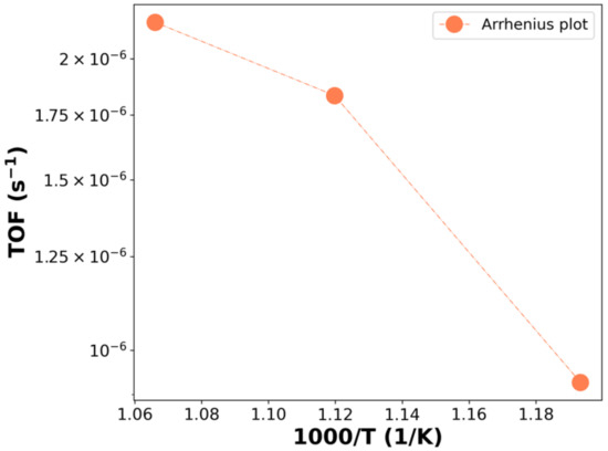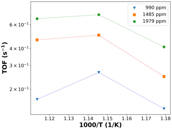 The change in the slopes of Arrhenius plots for different values of toluene concentration in the feed reinforce the previously posed hypothesis of the correlation between surface coverage and the consequent reduction in Qi. Another explanation might be that at higher temperatures and lower toluene inlet concentrations, the adsorption step became slower and so, consequently, did the RDS. In fact, an RDS resulting in a negative activation energy is commonly associated with exothermic equilibrium reactions—such as the adsorption step—thus the behavior shown in Figure 4 can be also explained by a change of this nature in the reaction pathways.