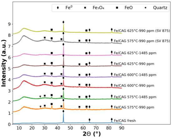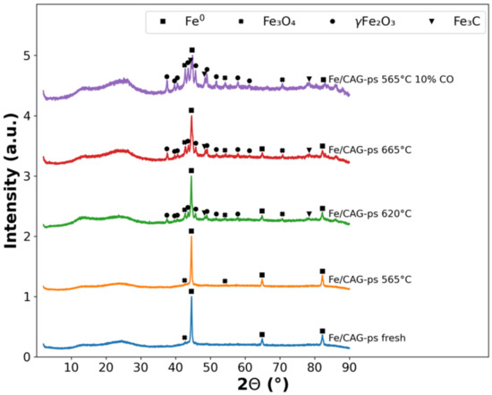 Figure 7 shows the behavior of experiments in dynamic conditions. These results evidenced a first period of stabilization where the conversion decreased at all reaction conditions. The total loss of activity registered for the steady state at 565 °C and 665 °C coincided with the extensive oxidation of Fe0 and the absence of carbides, as confirmed by the XRD pattern, as is discussed below. Conversely, the presence of CO in the gas stream at the same temperatures led to an increase in naphthalene conversion, even when the CO promoted the oxidation of metal clusters. This apparent contradiction suggests that, in the presence of CO, the reaction mechanism changed or the carbothermic reduction of FexOy was promoted, generating additional active sites for naphthalene conversion.