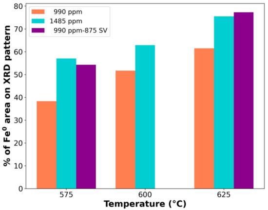 Figure 6 shows the percentages of the XRD peak areas corresponding to metallic Fe, which were calculated as the ratio of Fe0 peaks area/total pattern area; it was observed that the amount of active phase (metallic Fe) rose with temperature, while the space velocity showed a lower effect on Fe0 concentration. These results also allowed the discard of sintering and oxidation as the main deactivation causes at higher temperatures. It is important to note that the FeO:Fe3O4 ratio was almost constant at 3:2, and independent of the reaction conditions, which indicated that the type of iron oxide had no influence on the activity loss.