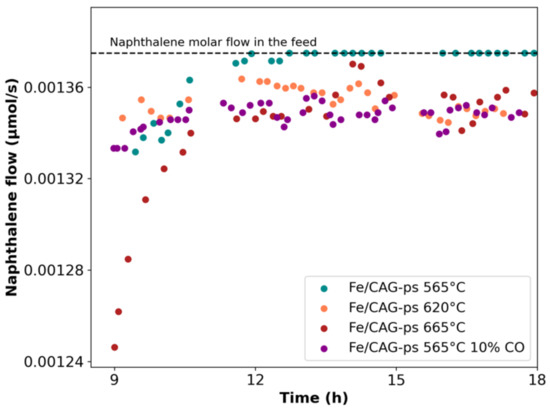 Naphthalene is considered the most difficult tar constituent to be decomposed [46]. As was described before, the Fe/CAG-ps catalyst (used at bench-scale) has similar properties to the Pd/CAG, but is shaped as pellets to avoid a high pressure drop in the catalytic bed.