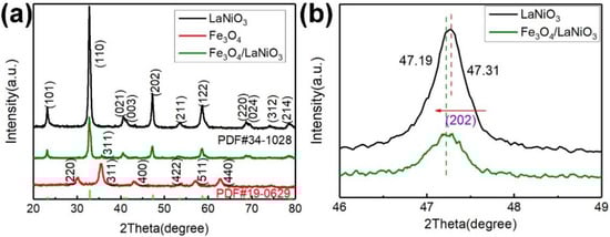 The XRD patterns of the synthesized LaNiO3, Fe3O4, and Fe3O4/LaNiO3 catalysts are shown in Figure 1a. It can be seen that the composite Fe3O4/LaNiO3 catalyst still maintains the main crystal plane of LaNiO3, such as 101, 110, 202, and 122. In addition, the peak of Fe3O4 appeared at 2θ of 35.4°, which also suggests that the Fe3O4/LaNiO3 composite material was successfully synthesized. It is important to note that there have been numerous reports in the literature on the offset of crystalline surfaces in metal oxide materials after bonding due to the creation of heterogeneous junction structures. The Bragg equation shows that when Fe3+ (r = 0.645 nm) is introduced into the material, it will combine with Ni3+ (r = 0.0600 nm) with a smaller ionic radius, leading to an increase in the crystalline spacing of the composite and a shift of the diffraction peak towards a lower angle []. A slight shift in the position of the peak at the crystalline plane of (202) was also found in the XRD image of the Fe3O4/LaNiO3 composite material in Figure 1b. So, this is presumed to be due to the formation of a heterojunction in the material composite, and the same conclusion was confirmed by TEM and XPS analysis.