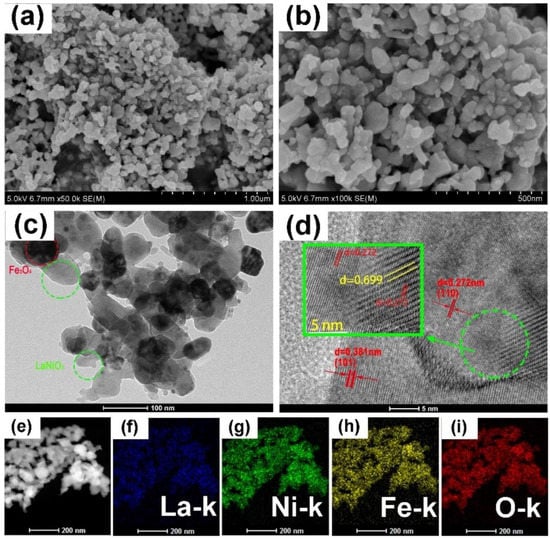 (a,b) SEM of Fe3O4/LaNiO3 catalyst; (c,d) TEM and HRTEM pictures; (e–i) EDX element mapping.