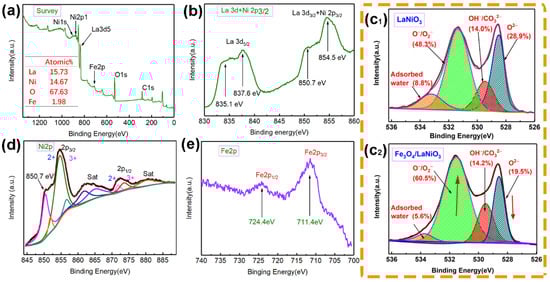 XPS spectrum of Fe3O4/LaNiO3 catalyst: (a) full spectrum; (b) La 3d; (c) O 1s; (d) Ni 2p; (e) Fe 2p.