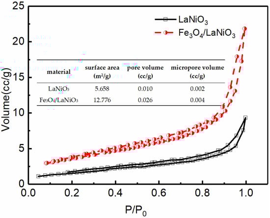 Information on the surface area, pore volume, and micropore volume of LaNiO3 and Fe3O4/LaNiO3 materials was obtained using N2 adsorption-desorption measurements (Figure 4). With the data from the BET test, it can be ascertained that the specific surface area of Fe3O4/LaNiO3 composite is 12.776 m2/g, which is 2.2 times that of LaNiO3 alone. The N2 adsorption-desorption isotherms showed type H3 (Figure 4), indicating that the pore structure is very irregular, which is consistent with the SEM (Figure 2a,b) conclusion. Compared to the LaNiO3 material alone, the improvement in surface area and pore volume of the Fe3O4/LaNiO3 composites is across the board. A larger specific surface area is usually more conducive to adsorption contact with the material and will provide more active sites, thus enhancing catalytic performance. Similarly, the increased porosity demonstrates that the material has more pores, which will provide a favorable site for the activation of oxygen in the air to produce active oxygen in the composite.