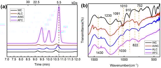 As shown in Table 1, compared with the catalyst free (WC), the total humic acid content of the reaction using LaNiO3 (ALC) and Fe3O4/LaNiO3 (AFC) catalysts increased by 17.32% and 16.26%, respectively, suggesting that LaNiO3 and Fe3O4/LaNiO3 showed excellent catalytic activity for weathered coal catalysis. Previous studies have shown that the ratio of E4/E6 decreases as the content of condensed aromatic rings increases []. The E4/E6 ratio of WC, AWC, ALC, and AFC showed a significantly increasing trend (Table 1), suggesting that humic acid contained a lower average molecular mass than the other treatments. Lower molecular weight products could be obtained. This was further verified by size exclusion chromatography []. The molecular weight distribution of humic acid is shown in Figure 5a. The initial HAs matter (WC) was distributed in the range between 70.0 and 5.0 kDa. The high molecular fractions of HAs were lost after ALC and AFC treatments, either by fragmentation into smaller molecules or by being polymerized into the other small molecule products.