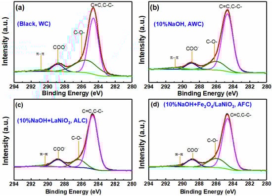 XPS C 1s spectra of four different treatments of humic acid (a) WC, (b) AWC, (c) ALC, and (d) AFC.