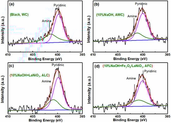 Four different treatments of humic acid XPS N 1s spectrum (a) WC, (b) AWC, (c) ALC, and (d) AFC.