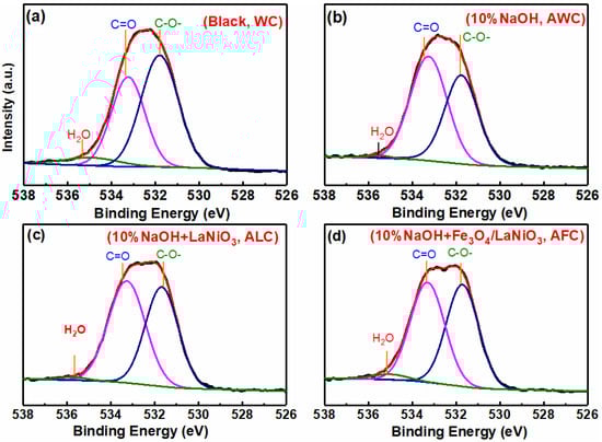 Focusing on the shift to O 1s XPS spectra of four different treatments of humic acid (Figure 8), generally, there are two peaks in the O 1s region, which represent the C-O- and C=O organic bonds, respectively []. After four different treatments, three peaks were found. The humic acid sample contains peaks with C=O and C-O- bonds, and another smaller peak of H2O, located at about 535.5 eV. However, the two peaks fitted at C-O- and C=O are shifted after Fe3O4/LaNiO3 catalysis (Figure 8d), and the increase of the C=O functional group (Table 3), which correspond to IR (1420 cm−1) results. The results indicated that these groups were formed during the catalytic treatment.