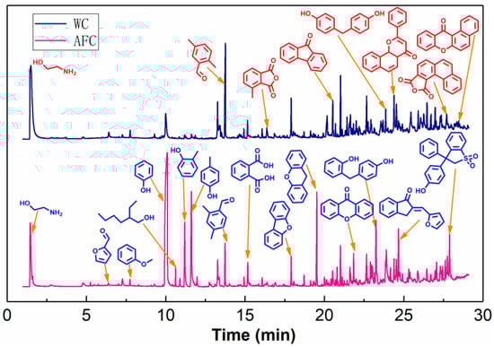 Further analysis of weathered coal humic acids from different treatments was carried out using thermal cracking gas chromatography-mass spectrometry (PY-GCMS) and the chromatograms are shown in Figure 10. Hence, it can be seen that the samples without catalyst (WC, grinding only) show fewer characteristic peaks and are concentrated in the regions of higher molecular weight. However, the samples treated with the Fe3O4/LaNiO3 catalyst (AFC) showed more characteristic peaks of the compounds and significantly more characteristic peaks in the small molecular weight region, in agreement with the results of the SEC tests. These phenomena suggest that the addition of a catalyst to the grinding effectively activates the weathered coal, allowing more humic acid molecules to escape the silicates in the coal sample. In addition, an increase in the number of functional group species containing oxygen in the samples after the addition of the Fe3O4/LaNiO3 catalyst can also be found. This indicates that the addition of the catalyst effectively activated the oxygen. Moreover, catalytic oxidation can occur with large molecular weight substances, and smaller molecular weight reactive groups are obtained. Overall, the Fe3O4/LaNiO3 composites showed excellent catalytic oxidation performance in the activation of weathered coal to produce humic acid under solid phase grinding conditions, with a significant increase in the content of small molecular weight reactive groups in the produced humic acid material.