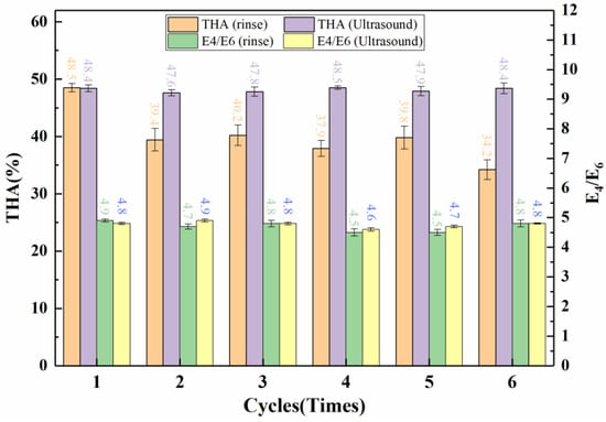 Similarly, one of the criteria for evaluating the efficiency of catalyst is the recycled property of the catalyst. We evaluated the recycling performance of the Fe3O4/LaNiO3 catalyst for six times (Figure 11). During the initial catalyst cycle experiments, the catalyst is recovered by magnetic separation, rinsed with water and ethanol, dried, and taken directly to the next cycle. The catalytic performance of the catalyst was significantly reduced in the first and second cycles, presumably due to some of the pore structures in the catalyst being blocked by humic acid molecules during the grinding process. Because of the large molecular weight and complex structure of the humic acid material, a simple rinse was not able to completely remove these residues. To test this suspicion, the used catalyst was placed in an ultrasonic cleaner for 30 min, dried, and put into the next cycle. The experimental results show that the catalysts recovered their catalytic capacity after ultrasonic cleaning and were essentially indistinguishable from the first use. In addition, the data obtained from each experiment using the ultrasonically treated material were more stable. However, considering the time and money spent on cleaning the catalyst with each ultrasonic treatment, we believe that the experimental results obtained with both treatment options are meaningful and that others may choose to use them depending on the situation.