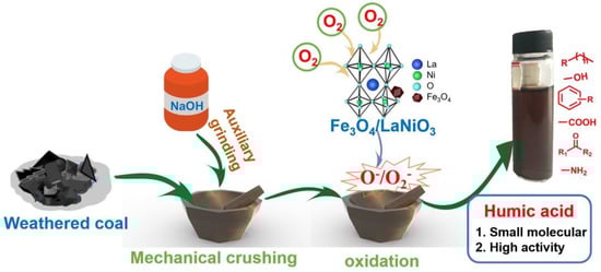 The Fe3O4/LaNiO3 material has been shown to be an excellent catalyst for the catalytic oxidation of weathered coal to humic acid under solid phase grinding conditions. The catalytic mechanism is shown in Figure 12. Firstly, since weathered coal contains a large number of inorganic silicates, the addition of sodium hydroxide during the grinding process can effectively promote the cracking of the silicates, thus releasing more humic acid molecules. The humic acid material obtained at this time has a large molecular weight and contains fewer oxygen functional groups. Secondly, the special electronic structure of the Fe3O4/LaNiO3 material effectively activates the oxygen in the air and transforms it into active oxygen molecules adsorbed on the surface (The large molecular weight of humic acid material obtained under vacuum conditions proves that oxygen in air is necessary). These reactive oxygen molecules will then react with the large molecules of humic acid material exposed by the cracking of weathered coal under the action of grinding []. Under the action of oxidation and mechanical forces, some of the chemical bonds in the large molecular weight humic acid material are broken to obtain the final product. The resulting humic acid material has the advantage of being small in molecular weight, high in oxygen functional groups, and high in activity. In addition, comparative experiments showed that the use of the Fe3O4/LaNiO3 catalyst gave 48.5% humic acid with >75% of small molecules. These results are significantly better than the data obtained using the LaNiO3 catalyst alone. Thus, the introduction of Fe3O4 not only allows the composite catalyst to be recovered by simple magnetic separation, but also adjusts the electronic structure of the LaNiO3 material and increases the reactive sites.
