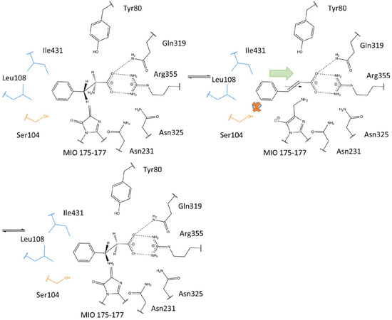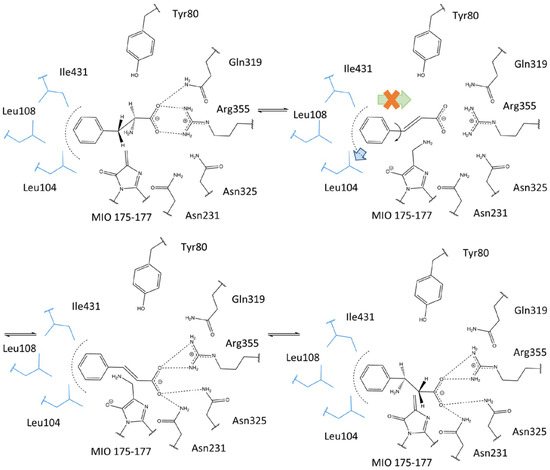 - Wang, K.; Hou, Q.; Liu, Y. Insight into the mechanism of aminomutase reaction: A case study of phenylalanine aminomutase by computational approach. J. Mol. Graph. Model. 2013, 46, 65–73. [Google Scholar] [CrossRef]