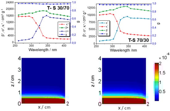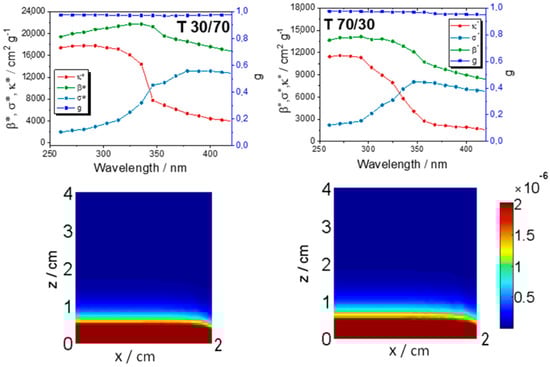 For simplicity, Figure 1 and Figure 2 illustrate the results using the methanol lean and rich cases. Differences in optical properties mainly correspond to the different aggregation state (secondary particle size) of the solids [,,]. As a main effect, we can highlight the decrease in the extinction coefficient observed as the methanol content of the mixture grows. The extinction coefficient has also a slightly different behavior with wavelength for the two samples under study. Such differences, particularly the first, lead to a (modestly) higher penetration depth along the “z” coordinate of the reaction vessel (see the bottom part of the figures). The samples display a g value above 0.95, indicating that in all cases, we have a dominating forward-scattering phenomenon. This could be characteristic of high surface area pure anatase samples [], which here renders a rather uniform rate of photon absorption value along the perpendicular coordinate to the light main propagation path (x coordinate in the plots of Figure 1 and Figure 2).