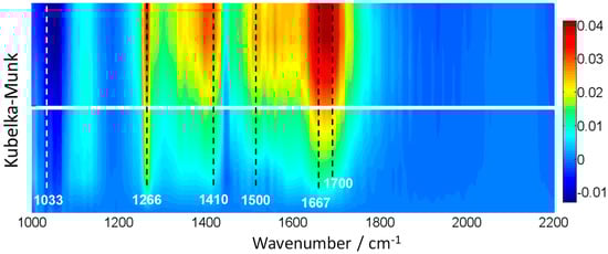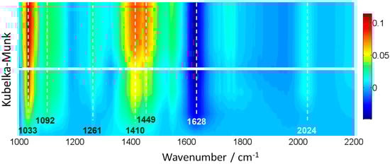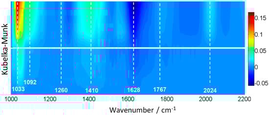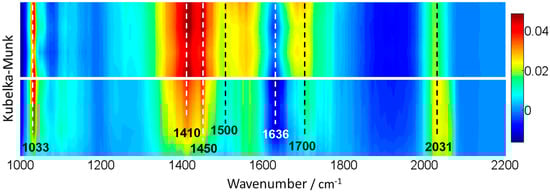 A Bruker Vertex 80 FTIR spectrometer (Bruker, Santa Barbara, CA, USA) with an MCT detector (OPUS/IR software, v6.3, Bruker, Santa Barbara, CA, USA) was used to obtain infrared spectra. The set-up uses a praying mantis DRIFTS accessory (Harrick Scientific, Pleasantville, NY, USA) and a reaction cell (HVC, Harrick Scientific). The reaction mixture was prepared by injecting the appropriate methanol/water mixture in a N2 flow before entering the DRIFTS cell. Parallel experiments were run with ethylene glycol. Inlet and outlet lines are heated at 130 °C. The DRIFTS spectra were collected in the range of 4000–600 cm−1 with a resolution of 1 cm−1, by averaging 10 scans over a total of ca 15 s. In DRIFTS experiments, in situ light excitation was carried out using the same illumination source that the one of the reaction system. Each catalyst without pre-treatment was subjected to a single, multi-step experiment. Such an experiment proceeds as: (i) adsorption of the reactive mixture under dark conditions and subsequent (ii) evolution under illumination conditions. Each step of the treatment is carried out up to the absence of spectral evolution (ca. 30–35 min).