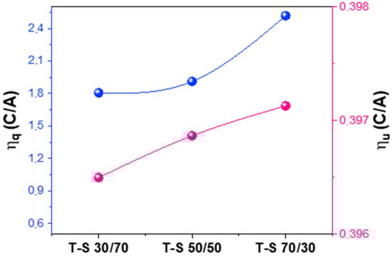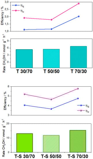 As mentioned in the introduction section, Equation (1) (quantum efficiency, ) and Equation (2) (fraction of photon use, ) allow comparing the performance of the samples quantitatively from different perspectives. In Figure 8, we present these two observables and the reaction rate as a function of the methanol content of the mixture. From 30/70 to 70/30 methanol/water mixtures, the reaction rate shows a moderate increasing value for both samples. The quantum efficiency measures differences accurately. As can be seen in the corresponding plots, the T-S sample triples (on average) the performance of the T sample. As a function of the methanol content of the mixture, both samples show enhancing activity, with a more or less constant behavior for methanol-lean mixtures and an increasing trend for methanol-rich mixtures and starting at the 50/50 mixture. Going from methanol-lean to methanol-rich mixtures, the T sample increases by ca. 50%, but the T-S sample only does it by ca. 10%. So, on a relative basis, the two samples display evident differences. Considering the photon use (now expressed in percentage), we can observe than the magnitude is higher than in the case of the quantum efficiency. The higher values of the “photon use” come from S factors below unity. Nevertheless, the overall trend is similar to the quantum efficiency both in terms of the comparison between samples as well as the methanol content of the reaction mixture. Yet fine (identifiable and significant) details differentiate the behavior of the two efficiency observables, as previously discussed.