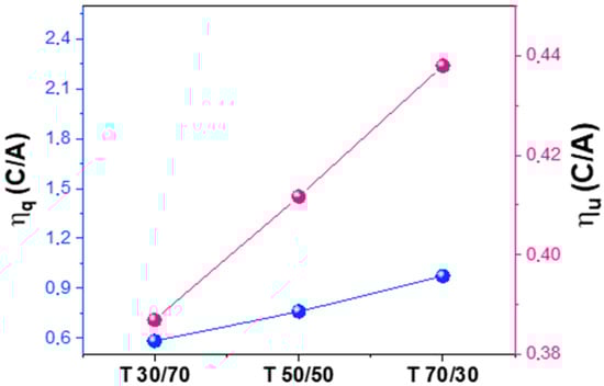 Ratio of efficiency observables (quantum efficiency, , and photon usage, ) between the contribution of carbon-centered (C in the figure) and alkoxy (A in the figure)-derived reaction products. T and T-S samples are presented (see OX axis labels).
