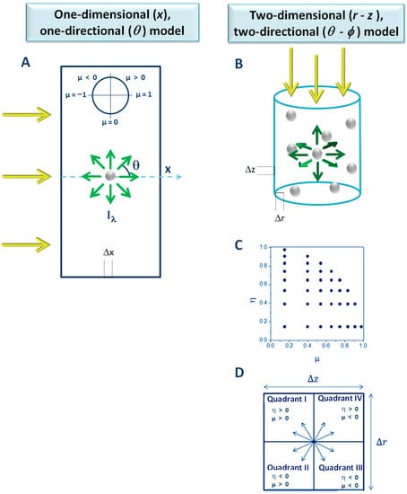 Spectrophotometric cell and one-dimensional, one-directional radiation model (A). Reactor vessel and two-dimensional, two-directional radiation model (B–D). The directional mess for quadrant I and the representation of the quadrants (at each spatial point) are presented in panels (C,D), respectively.