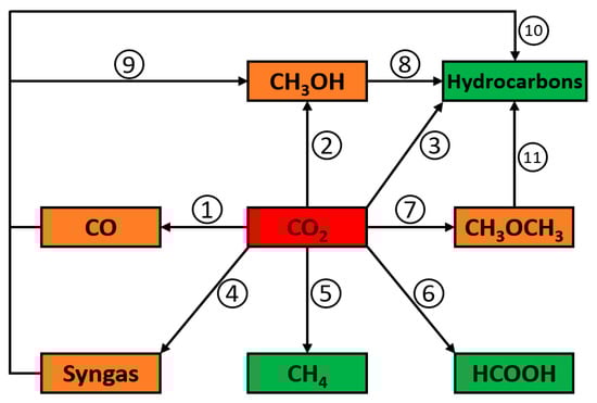 The possible catalytic conversion routes are shown in Figure 2, and the representative reactions along with the typical catalysts are summarized in Table 1. The ultimate products are distributed from methane and formic acid to hydrocarbons (light olefins, liquefied petroleum gas (LPG), gasoline, aromatics, etc.). The most conspicuous intermediates are CH3OH and CO, owing to the relatively mature technologies of methanol to hydrocarbons (MTH) (including methanol to olefin (MTO), methanol to aromatics (MTA), methanol to gasoline (MTG), etc.) and Fischer Tropsch synthesis (FTS) adopted in the current chemical industry. Methanol often serves as the starting feedstock for several useful chemicals such as gasoline, dimethyl ether, oxymethylene ethers, or as an additive or fuel in engines and fuel cells [42,43]. Recently, methanol was proposed to be the candidate alternative to oil and gas to generate a “methanol economy” [44]. In this situation, the hydrogenation of CO2 to produce methanol would be one of the key reactions for building energy recycling loops.