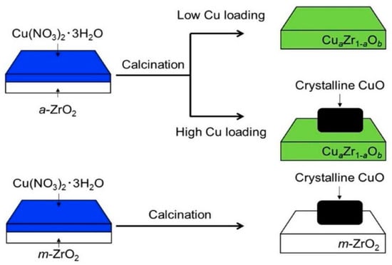 Proposed formation mechanism of CuaZr1−aOb, CuO/CuaZr1−aOb, and CuO/m-ZrO2. Reprinted with permission from ref. [111]. Copyright 2018 American Chemical Society.