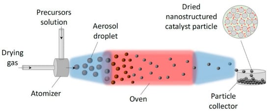 Schematic view of the AASG process that can be operated in a continuous mode for the one-pot production of nanostructured catalysts. The precursor solution contains a solvent, metal precursors, and a templating agent (e.g., a surfactant that will form micelles via evaporation-induced self-assembly, EISA). The droplets formed by atomization are transported in a drying gas towards a drying zone where the formation of structured particles takes place. Reprinted with permission from ref. [121]. Copyright 2020 Wiley.