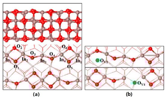 (a) Optimized structure of the In2O3(110) surface, side view (upper), and top view (lower). (b) The D1 (upper) and D4 (lower). Reprinted with permission from ref. [42]. Copyright 2013 American Chemical Society.